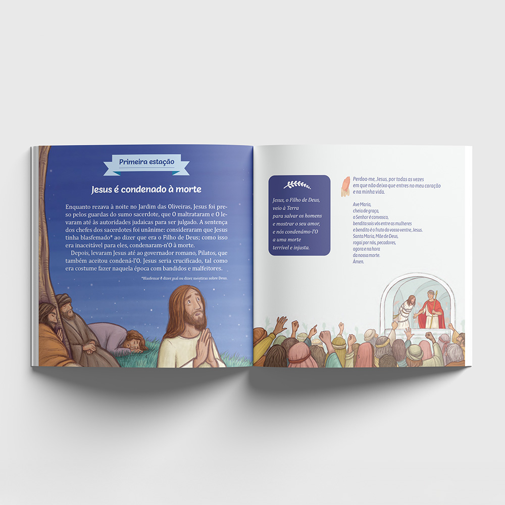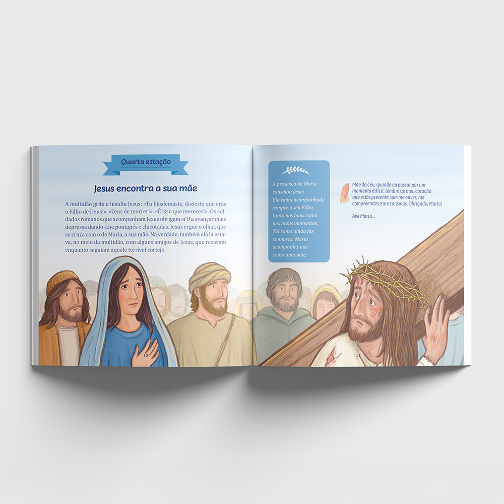 Os textos explicativos, acompanhados de meditações, ajudarão pequenos e grandes a reconhecer os acontecimentos da Paixão, e sobretudo a compreender o que eles nos revelam sobre o nosso Deus, um Deus que nos ama tanto que é capaz de sofrer e dar a Sua vida por nós!